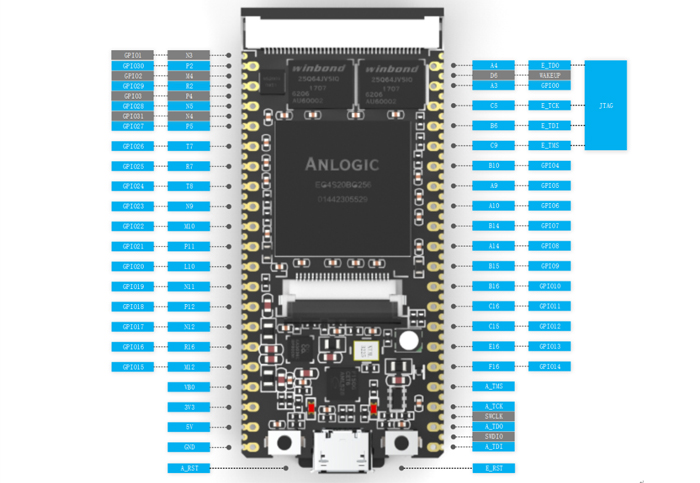 荔枝糖使用 安路科技(Anlogic Technologies) 的 EG4S20 作为核心单元, 20K 逻辑单元(LUT4/LUT5混合架构),约130KB SRAM,内置32bit位宽 64MBit SDRAM,丰富的LVDS引脚,内置12-bit 1MSPS ADC ,这为荔枝糖提供了无限的可能性: